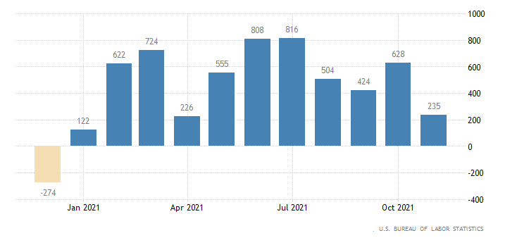A rilento anche il settore non-agricolo privato, dove nel mese di novembre sono stati creati solo 235 mila nuovi posti di lavoro, contro i 628 mila (dato rivisto da 604 mila) di ottobre e ben al di sotto di un consensus fissato a 530 mila. I due dati sono rilasciati dall’U.S. Bureau of Labor Statistics.