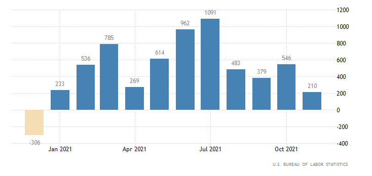 A novembre nel settore non-agricolo sono stati creati solo 210 mila posti di lavoro deludendo di parecchio le attese. Un dato in forte contrazione rispetto ad ottobre, quando i nuovi posti di lavoro erano stati 546 mila (dato rivisto da 531 mila), ed anche in direzione opposta rispetto al consensus, che prevedeva per novembre un rialzo a 550 mila. Tra i settori, delusioni da leisure e hospitality mentre education continua a calare.