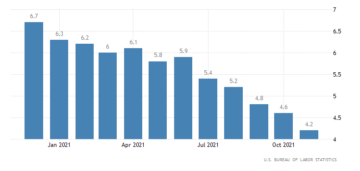 Contrazione dello 0,4% per il tasso di disoccupazione, che a novembre scende al 4,2% dal 4,6% registrato ad ottobre. Un calo anche superiore a quello previsto dal consensus, pari al 4,5%. Come scritto in precedenza si nota una forte discrepanza tra questo dato e quello dei nuovi occupati. Il dato è rilasciato dall’U.S. Bureau of Labor Statistics.