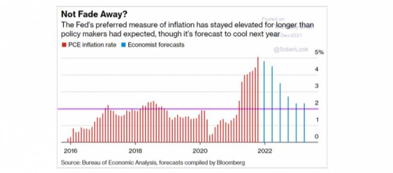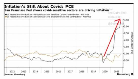 Fino a qui i compitini dei bravi economisti. Purtroppo l’esercizio conteneva un errore e gli economisti si sono persi in un bicchiere d’acqua. L’inflazione dipende dal Covid come dimostra il grafico che segue e se un giorno ti dicono che arriva la variante Omicron e negli Usa hai 100.000 contagiati al giorno e 1000 morti il castello di previsioni diligentemente fatte cade fragorosamente (la freccia rossa indica l’andamento dell’inflazione Covid sensitive: