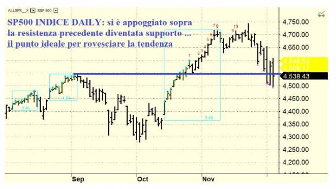 Io sto parlando degli USA ma la situazione in Europa ed in Italia è esattamente la stessa: l’inflazione in Italia dati Istat su base tendenziale novembre 2021 (adesso la chiamano ufficialmente “su base annua” ovvero novembre 2021 / novembre 2020 dopo aver predicato nel vuoto che non li capiva nessuno con “tendenziale” e “congiunturale” per 50 anni …) è del 3.8% ovvero significa che una mia vecchia zia che ha 110.000 euro sul conto corrente ad una remunerazione tutto sommato dignitosa fino a pochi mesi fa non essendoci nessuno vincolo su quei soldi dello + 0.50% ogni anno senza tenere conto delle tasse si mangia il 3.3% del capitale. Il ragionamento è lineare: i mercati temono l’inflazione e l’inflazione è figlia del Covid e se il Covid continua aumenta l’inflazione. Ma se aumenta l’inflazione non possono certo calare le azioni e gli immobili perché sono asset reali che reggono all’urto dell’aumento dei prezzi. Quindi la conclusione è che il ribasso di questi giorni non è definitivo cioè non dovrebbe essere un fine corsa. Non so se ci sarà il rally di Natale, il sentimento è che ci sarà, ma so che finché non cambia la scena gli attori sono gli stessi e quindi non ci possiamo discostare molto da quello che è successo finora. Di solito quando i prezzi dell’SP500 lambiscono la media mobile a 50 giorni e abbiamo una discesa dei prezzi intorno al 30% i “deep buyers” iniziano a comprare e mi sa che qui ci siamo: se guardiamo l’SP500 vediamo che si è appoggiato alla precedente resistenza diventata supporto e le chiusure fanno fatica a discostarsi l’una dall’altra ovvero abbiamo trovato un’area di attrito: