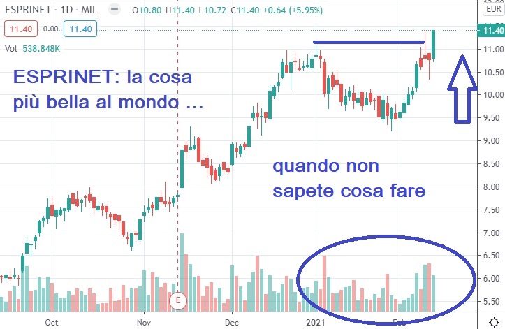 Come amo ripetere da anni quando non sapete cosa fare comprate Esprinet ... noi per il momento siamo pieni come ovetti e passiamo la mano con i buy ufficiali ma non nascondo che la tentazione è forte ...