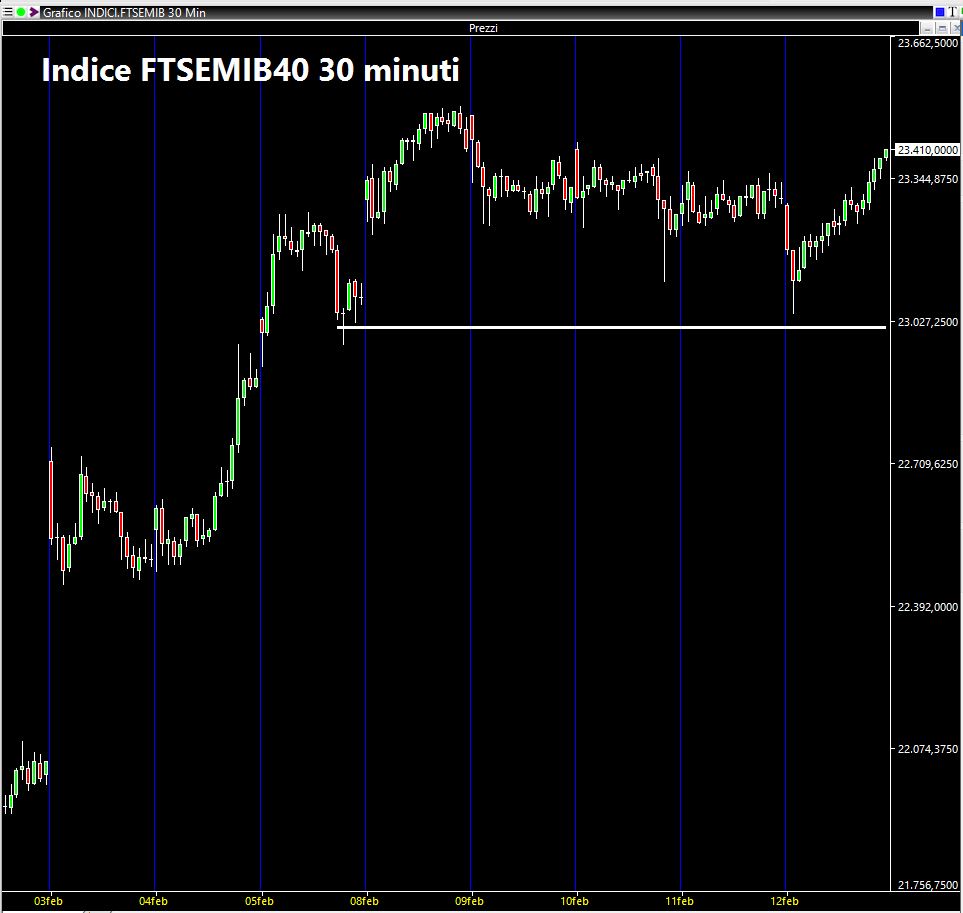 L'aspetto che mi preme evidenziare è prima di tutto che i piccoli supporti segnalati sabato scorso non sono mai stati nemmeno lambiti e nel complesso il mercato italiano sta ancora smaltendo l'effetto Draghi, senza tuttavia modificare il trend rialzista il cui barometro continua a segnare verso nord. Ciò naturalmente non implica che la strada non sia potenzialmente accidentata e che ci possano essere degli ostacoli. Questo lo si nota dal fatto che le improvvise vendite che hanno caratterizzato l'indice intraday durante quest'ultima ottava sono state prontamente riassorbite. Vendite durate generalmente un'ora di contrattazione o poco più. Osserviamo subito questo aspetto su un chart a 30 minuti, in cui notiamo subito un colpo di reni sul finale di settimana. Questi scarichi sono dovuti naturalmente al profit taking di qualche operatore, ma il fatto che il FTSEMIB40 sia in grado di reggere a tali scossoni è un fattore positivo al momento. Sempre pronto a modificare la mia view a seconda del mutare delle condizioni di mercato.