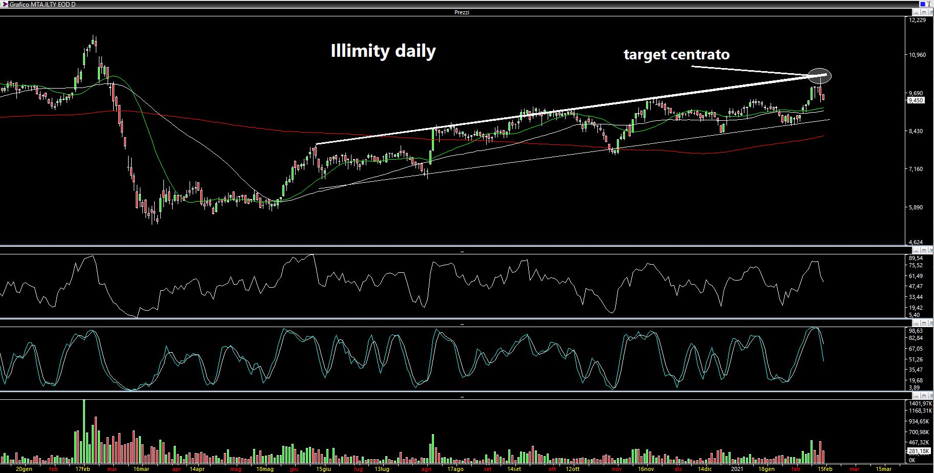 Avevo poi scritto dell'interessante configurazione grafica di Illimity Bank che ha millimetricamente raggiunto l'area target indicata nell'update infrasettimanale attorno a 10.20 (link: https://www.lombardreport.com/2021/2/6/analisi-settimanale-3/). Il grafico si presentava così (rivisto leggermente al ribasso nell'update di mercoledì per filtrare la volatilità):