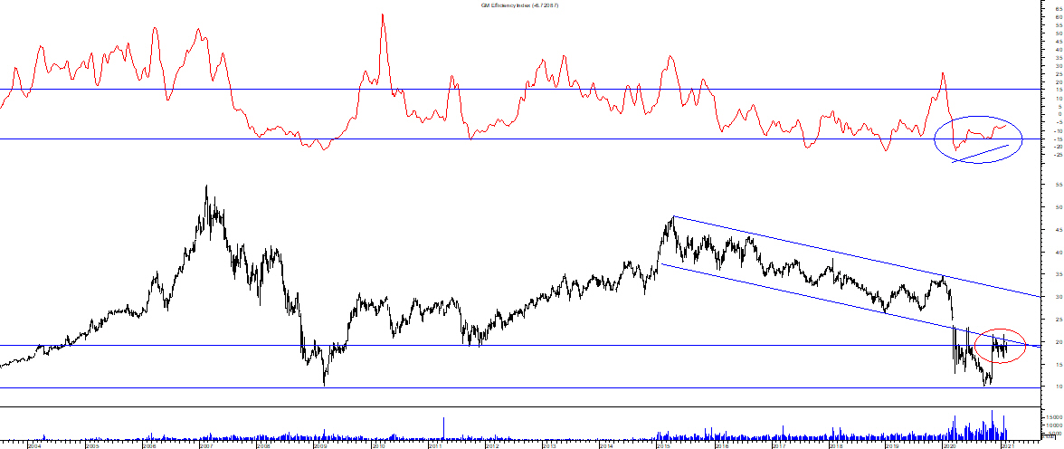 L’Efficiency index evidenzia una divergenza rialzista sul grafico weekly, mentre i volumi sono relativamente elevati.