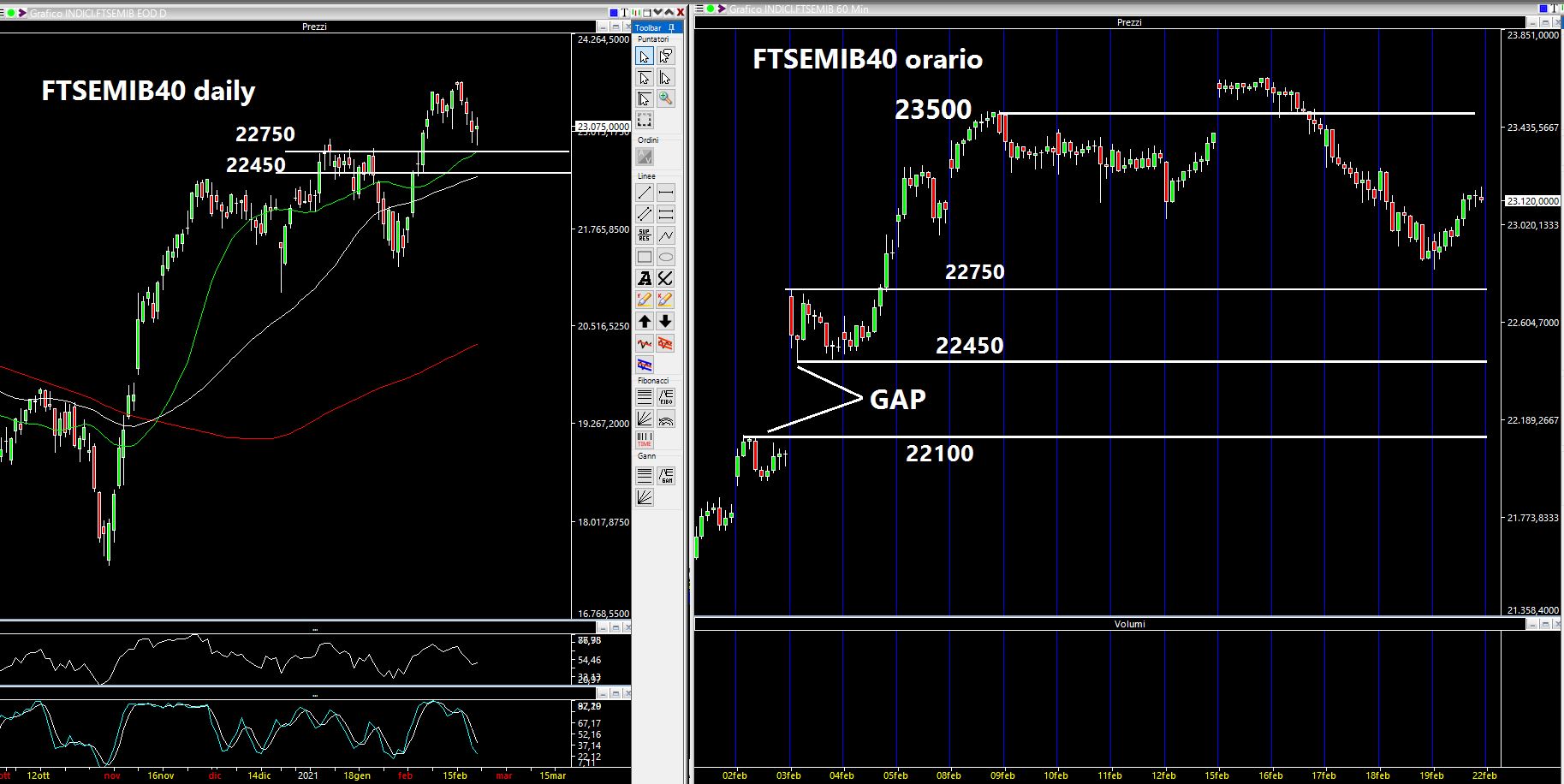 Come supponevo e come avevo scritto la rottura dei 23500 avvenuta addirittura in gap up di lunedì si è poi rivelata un falso movimento rialzista, giusto per attrarre un pò di liquidità (quella poca rimasta) per poi squeezarla al ribasso con una serie estremamente lineare di barre ribassiste a 60 minuti, interrottesi solo pazialmente nella seduta pomeridiana di venerdì dopo il test dei 23000. Proprio per questo motivo avevo deciso di intitolare l'articolo di sabato scorso "Mercato ben impostato, ma attenzione ai falsi segnali" (link: https://www.lombardreport.com/2021/2/13/analisi-mercato-2/). Ovviamente tale situazione non poteva far altro che ripercuotersi sui titoli principali e di riflesso su quelli secondari.