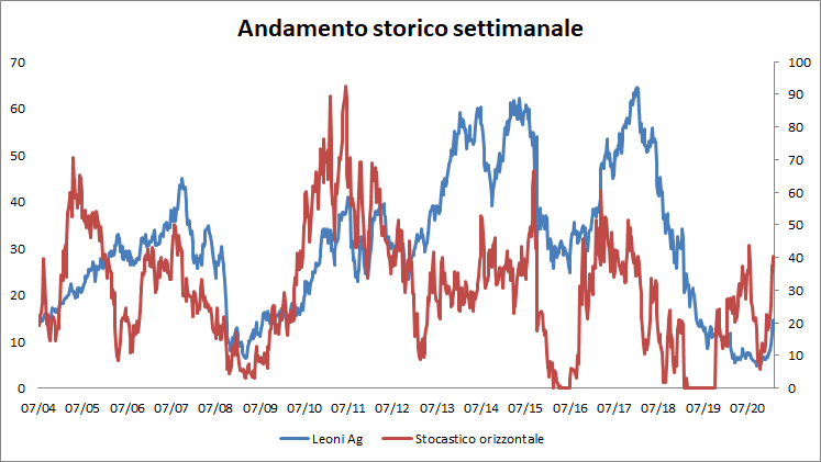 Il titolo è collocato sul gradino più basso dello Stocastico orizzontale daily, anche se colgo l’occasione per ribadire che ciò non indica che sia inserito all’interno di un contesto ribassista, ma soltanto che abbia fatto un po’ meno bene degli altri durante l’ultimo anno.