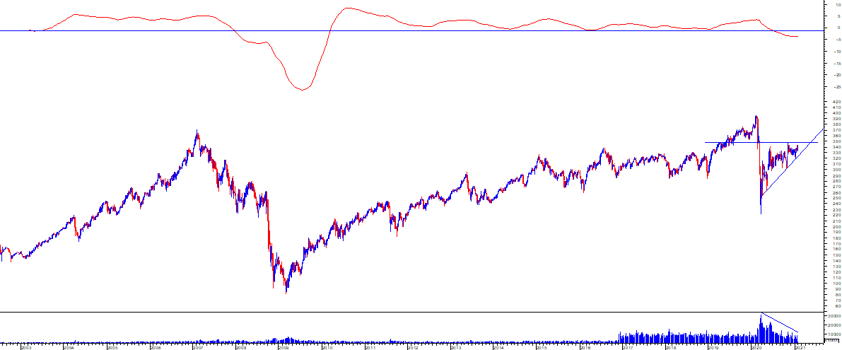 Tuttavia, dalla fine del successivo mese di marzo, ha accusato un trend quasi costantemente discendente dei volumi, ciò che lo ha penalizzato nella fase di ripresa, tanto è che fatica a oltrepassare la resistenza statica di 345/50 circa. I volumi sono da monitorare con cautela in quanto tendono a stabilizzarsi da qualche settimana in procinto, forse, di una ripresa che potrebbe favorire l’indice.