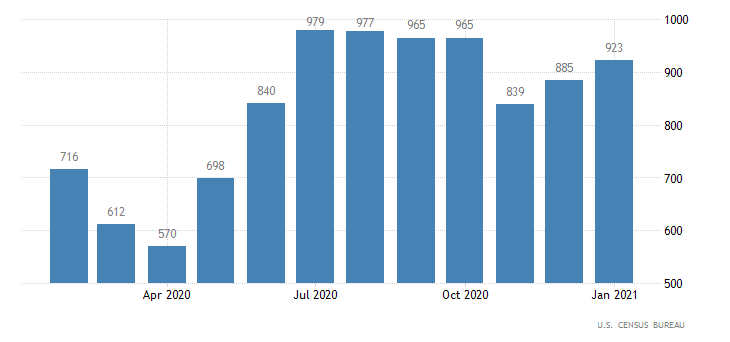 In rialzo il numero di case vendute, che a gennaio segna un +4,3% passando da 885 mila (dato revisionato) a 923 mila, contro una stima che prevedeva un calo a 855 mila. Il dato è elaborato dall’U.S. Census Bureau.
