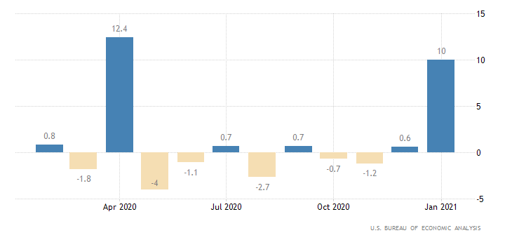 Balzo a gennaio del reddito personale che aumenta al +10% a causa dell'impatto del piano fiscale varato a fine dicembre dall'amministrazione uscente: un dato così alto non si vedeva da aprile. Un bell’aumento rispetto al +0,6% di dicembre; il dato di gennaio è stato anche superiore alle attese (consensus 9,5%). Dopo due mesi consecutivi con il segno ‘meno’, invece, tornano a crescere le spese personali registrando un +2,4%, restando però appena sotto le stime (+2,5%). Il dato di gennaio è il più alto registrato da giugno ad oggi. Sia il dato sul reddito personale, che quello sulle spese personali sono rilasciati dall’U.S. Bureau of Economic Analysis.