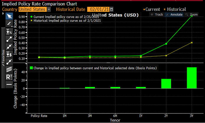 L'attuale situazione sui risk asset poggia, almeno in parte, sulla prospettiva di QE al ritmo attuale ancora per trimestri, e tassi stabili fino al 2023. Ma i recenti movimenti hanno portato il mercato dei tassi USA a prezzare un rialzo dei tassi l'anno prossimo e altri 2 nel 2023.