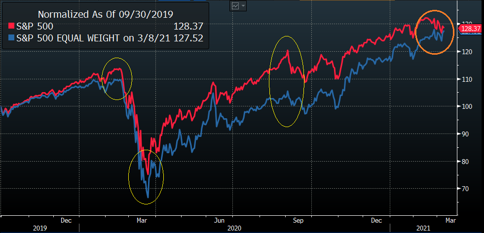 Come si nota dal grafico, recentemente sta succedendo l'opposto, con le large caps che zavorrano l'indice, e la performance del resto dei titoli che va a compensare. I 15 punti di outperformance del S&P500 suo omologo “equal weight” accumulati tra settembre 2019 e settembre 2020 sono stati quasi cancellati.
