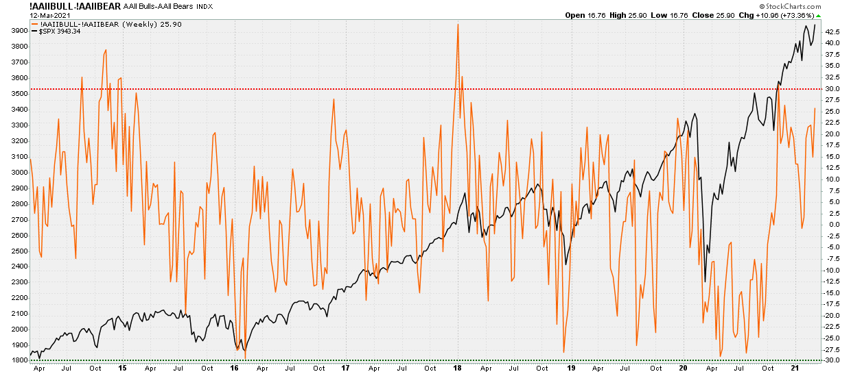 Analoga situazione per quanto riguarda il sentiment che regna tra gli investitori. Il rapporto tra Rialzisti e Ribassisti è salito a 25,90 rispetto a 15 della precedente settimana (v. grafico):