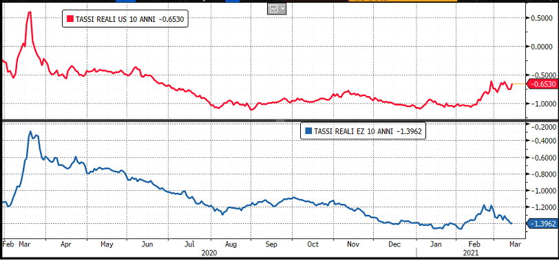 Visto che la curva dei rendimenti USA con il 10 anni che rimane stabilmente sopra 1.6%, livello sopra il quale non ha mai chiuso nell'ultimo anno, sembra che gli investitori in azioni si stiano adeguando a questa nuova situazione non dando più l’importanza vista negli ultimi periodi a questo dato. La salita dei rendimenti USA poi ha visto il contributo venire interamente dai tassi reali, che sono saliti di 9/10 bps, mentre le attese di inflazione si sono lievemente assestate. A tal proposito in settimana si riunirà il FOMC e da indiscrezioni circolate sembra che alcuni membri della FED potrebbero alzare la loro previsione personale dei Fed Funds nel 2023. Di seguito il grafico tra i tassi reali a 10 anni USA ed UE: