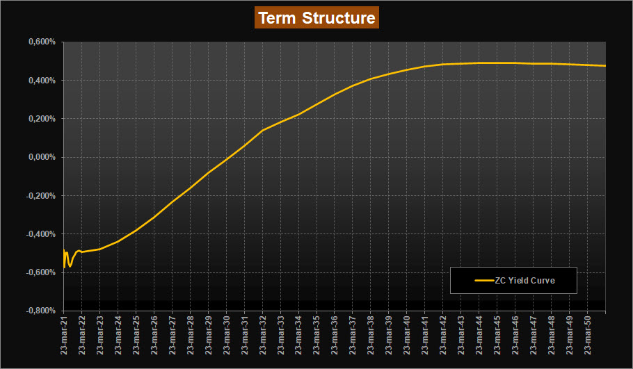 La lettura della ZC-Yield Curve mostra una certa stabilità dei rendimenti sul tratto a medio, mentre prosegue ad allargare sul tratto a lunga, rispetto alla scorsa analisi. E’ quindi decisamente confermato il cambio di rotta sul mercato del reddito fisso, nonostante le Banche Centrali rimangano particolarmente accomodanti in termini di politica monetaria. Il rendimento della scadenza a 10 anni rimane pressocché stabile in area 0,06% mentre la scadenza trentennale sale allo 0,48% dal precedente 0,40%. Solo tre mesi fa eravamo al -0,02% di rendimento su questa scadenza. Confermato anche il cambio della forma della curva, con la parte a breve e medio sempre inclinata circa a 45° e molto piatta sulle scadenze lunghe. La curva evidenzia ora un massimo di rendimento sulle scadenze 2043-2046, in crescita rispetto alla scorsa rilevazione e ora appena di un soffio sotto area 0,50% rispetto allo 0,40% della precedente analisi e rispetto allo 0,05% di due mesi fa. Lieve salita per i tassi forward su Euribor 6 mesi, con il tratto a lunga che va ora in area 1,02%, mentre è stabile il tratto a breve che conferma l’inclinazione positiva ormai diretto a -0,40% di rendimento, lontano da area -0,60%/-0,50% osservata per moltissimi mesi addietro.