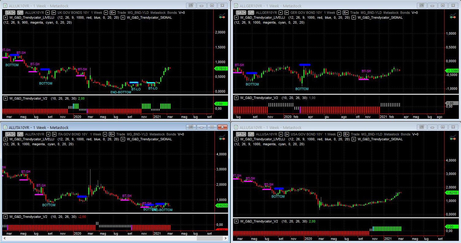 Osservando – a livello di analisi integrata – le curve dei rendimenti dei principali benchmark decennali, è ormai chiaro che siamo entrati in una nuova fase per il mercato obbligazionario, per cui possiamo dire col senno del poi che anche in questo caso il modello Trendycator ci aveva visto giusto già da tempo. Sull’area UK prosegue la salita dei rendimenti, ora diretti speditamente a 0,80% rispetto al precedente 0,60% e con Trendycator confermato su LONG. Un po’ più pacata la salita dei rendimenti tedeschi, che provano a stabilizzarsi contraendosi un po’ rispetto alla scorsa analisi; il BUND, infatti, ora viaggia intorno ad area -0,34% di rendimento e modello Trendycator ancora in stato NEUTRAL. Più stabili i rendimenti del nostro Btp, che evidentemente beneficiano ancora dell’effetto Draghi e stanno ritracciando un po’ con il decennale che si è portato in area 0,62% rispetto al precedente 0,80%; modello Trendycator che rimane SHORT ed evidenza di END-BOTTOM confermata. Come visto nell’articolo, spiccano il volo i rendimenti dell’area USA con il Treasury decennale che schizza addirittura oltre l’1,60% con Trendycator ormai consolidato su LONG.