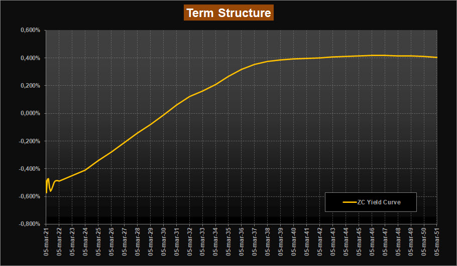 La lettura della ZC-Yield Curve mostra una decisa crescita dei rendimenti rispetto alla scorsa analisi. Il cambio di rotta, rispetto alla calma piatta che ha regnato sovrana e indisturbata per moltissimi mesi, pare robusto e tutti i tratti della curva ne sono interessati. Il rendimento della scadenza a 10 anni riconquista il territorio positivo attestandosi ora allo 0,06% dal precedente -0,17% mentre la scadenza trentennale vola allo 0,40% dal precedente 0,14%. Due mesi fa eravamo al -0,02% di rendimento su questa scadenza. Cambia nettamente anche la forma della curva, con la parte a breve e medio inclinata praticamente a 45° e piattissima sulle scadenze lunghe. La curva evidenzia un massimo di rendimento sulle scadenze 2042-2043, in netta crescita rispetto alla scorsa rilevazione e ora poco sopra area 0,40% rispetto allo 0,16% del mese scorso e rispetto allo 0,05% di due mesi fa. Salgono con vigore anche i tassi forward su Euribor 6 mesi, con il tratto a lunga che va ora in area 1,00%, così come il tratto a breve che inizia ad inclinarsi positivamente puntando area -0,40% dall’intervallo di area -0,60%/-0,50% osservato per molti mesi addietro.