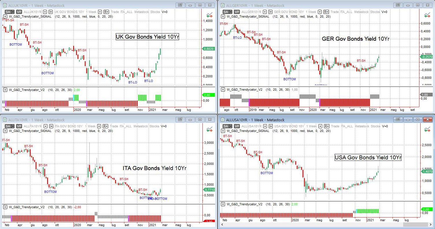 Osservando – a livello di analisi integrata – le curve dei rendimenti dei principali benchmark decennali, è netto ed evidente il cambio di impostazione, che in parte era già stato anticipato su alcune aree. Il cambiamento è stato abbastanza rapido e si è consumato in poche sedute, anche se non in modo omogeneo su tutte le aree valutarie. Ad esempio, sull’area UK le prime avvisaglie si erano già manifestate tra la fine del 2020 e l’inizio del 2021, e ora è conclamato il passaggio del modello Trendycator a LONG dal precedente NEUTRAL, con rendimenti che sono schizzati oltre area 0,60% dal precedente 0,30%. Mette le ali anche il rendimento del BUND, con volatilità in deciso aumento e modello Trendycator che si trova ancora in stato NEUTRAL, ma con una dinamica che potrebbe portarlo a LONG; il rendimento del decennale tedesco è ora in area -0,25% dal precedente -0,50%. Risalgono anche i rendimenti del nostro Btp, dopo l’euforia della nomina di Mario Draghi a capo del nostro esecutivo che ha portato il decennale sotto lo 0,50% di rendimento e il modello Trendycator ad evidenziare un END BOTTOM. Ora il nostro benchmark si è portato verso lo 0,80% con Trendycator che rimane SHORT e spread crollato nell’intorno di area 100bps. Prendono il volo anche i rendimenti dell’area USA con il Treasury decennale che schizza addirittura oltre l’1,50% di rendimento per poi assestarsi in area 1,40% e con Trendycator ormai stabilmente LONG.