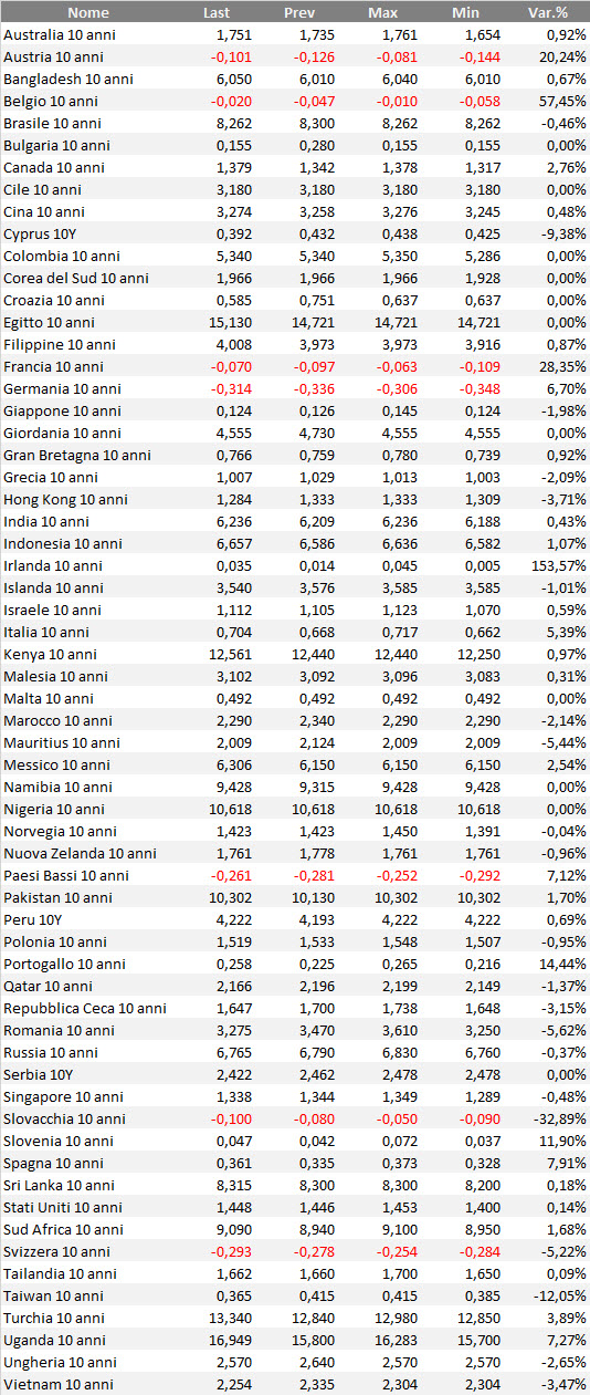 Analisi sotto forma di ranking dei bond governativi mondiali con qualunque rating. In alcuni casi, per alcuni emittenti o per alcune valute, il rapporto rischio/rendimento di questi bond può essere anche piuttosto speculativo. Il ranking considera i bond benchmark decennali in tutte le valute di emissione.