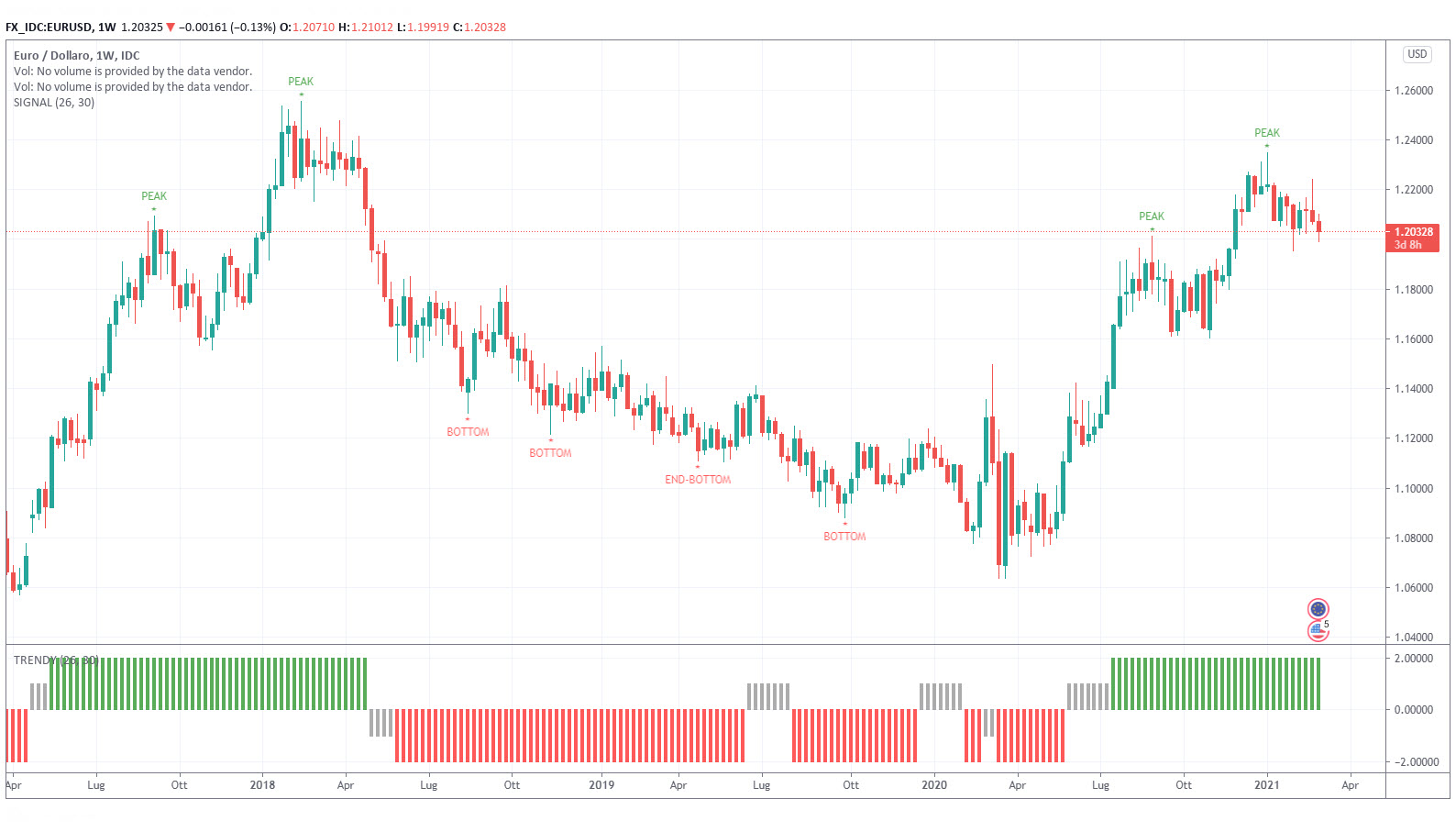 Infatti, è molto probabile che un ritorno sotto 1,20 possa portare ad un cambio di stato del modello Trendycator, portandolo in posizione NEUTRAL e dando quindi un primo segnale di possibile inversione dell’attuale trend. Inoltre, vista la dinamica sul grafico, rispetto al mese scorso pare ora più remota – anche se non possiamo naturalmente escluderlo a priori – la possibilità di rivedere area 1,24.