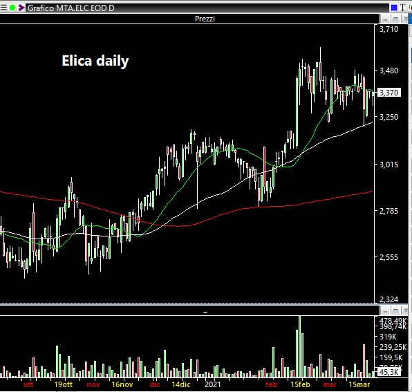 Nella passata ottava (articolo: https://www.lombardreport.com/2021/3/13/commento-settimanale-e-titoli-in-watchlist/) avevo commentato il titolo Philogen, mettendo in evidenza come il rialzo non fosse stato accompagnato dai volumi e quindi non sfruttabile. In settimana c'è stato un nuovo drastico calo di volumi nemmeno visibili sul daily ed un nuovo consolidamento verso il basso. Non escludo possa risalire, ma in queste condizioni non opererò.