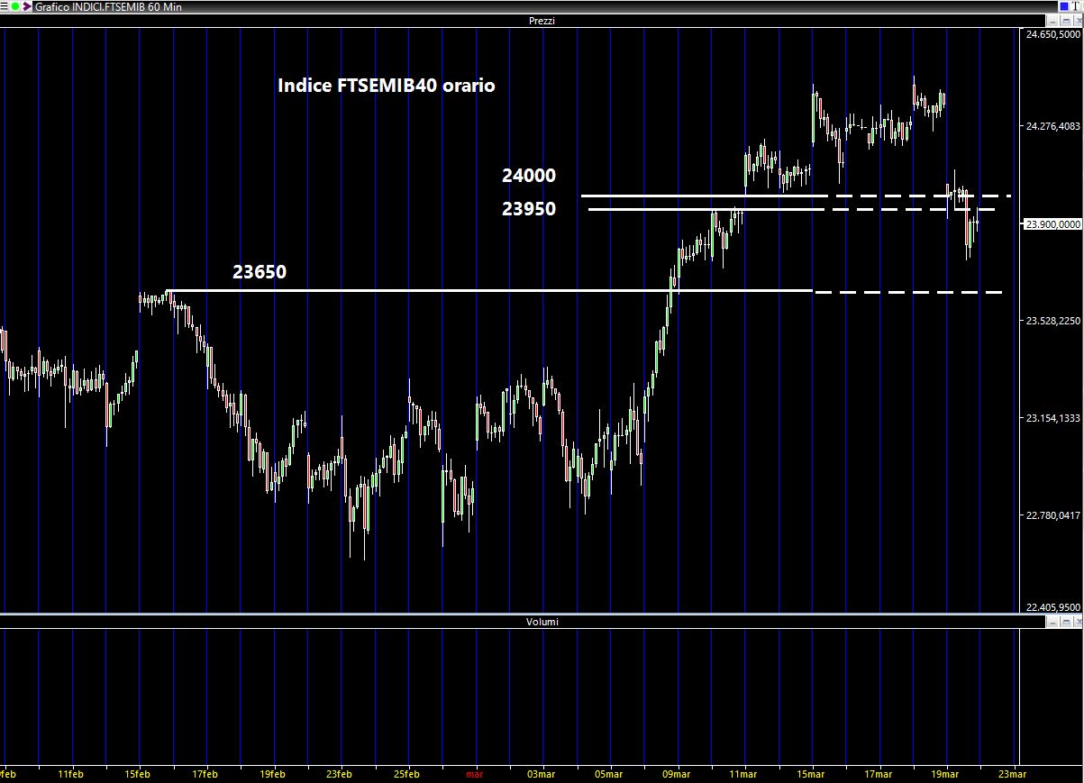 Per la prossima settimana i livelli supportili sono collocabili a 23600, 23300 ed eventualmente a 22700 (altamente improbabile). Credo tuttavia che il mercato cerchi di andare a chiudere il piccolo gap down della seduta di venerdì (circa 200/300 punti). Occorrerà però rientrare nei 24000 naturalmente.