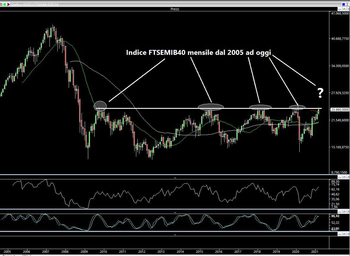 Allargando l'orizzonte temporale su scala mensile dal 2005 ad oggi notiamo tuttavia qualcosa di molto interessante: tutte le volte che l'indice italiano è arrivato in quest'area (tra 24200 e 25500 come estensione massima dell'anno scorso) è sempre sceso. Questo per quanto attiene all'analisi grafica. Sarà così anche questa volta? E se sì, per quanto tempo? Credo che proprio per questo motivo occorra procedere per piccoli passi analizzando sempre di settimana in settimana l'effettiva evoluzione. Da notare anche come lo stocastico mensile abbia sempre (fino ad ora) individuato i punti di swing ribassisti ed oggi ci troviamo in una situazione di ipercomprato, condizione necessaria -ma non sufficiente- per eventuali inversioni di trend. Dico necessaria ma non sufficiente per il semplice fatto che quando un trend risulta fortemente rialzista (o ribassista) anche le fasce di overbought/oversold andrebbero traslate verso l'alto (o verso il basso).