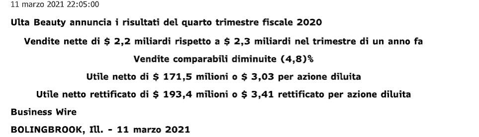 L’11 marzo scorso, ULTA BEAUTY ha reso noto i risultati dell’ultimo trimestre relativo al tragico 2020. Vediamo qui di seguito i tratti salienti: