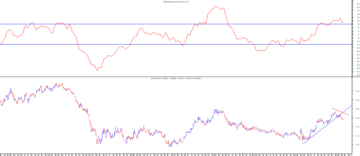Il mio Efficiency index tende a riportarsi al di sotto di +15 e si appoggia nuovamente a tale livello, ora supporto. Questo mi fa pensare che la divisa europea si trovi in un momento molto particolare.