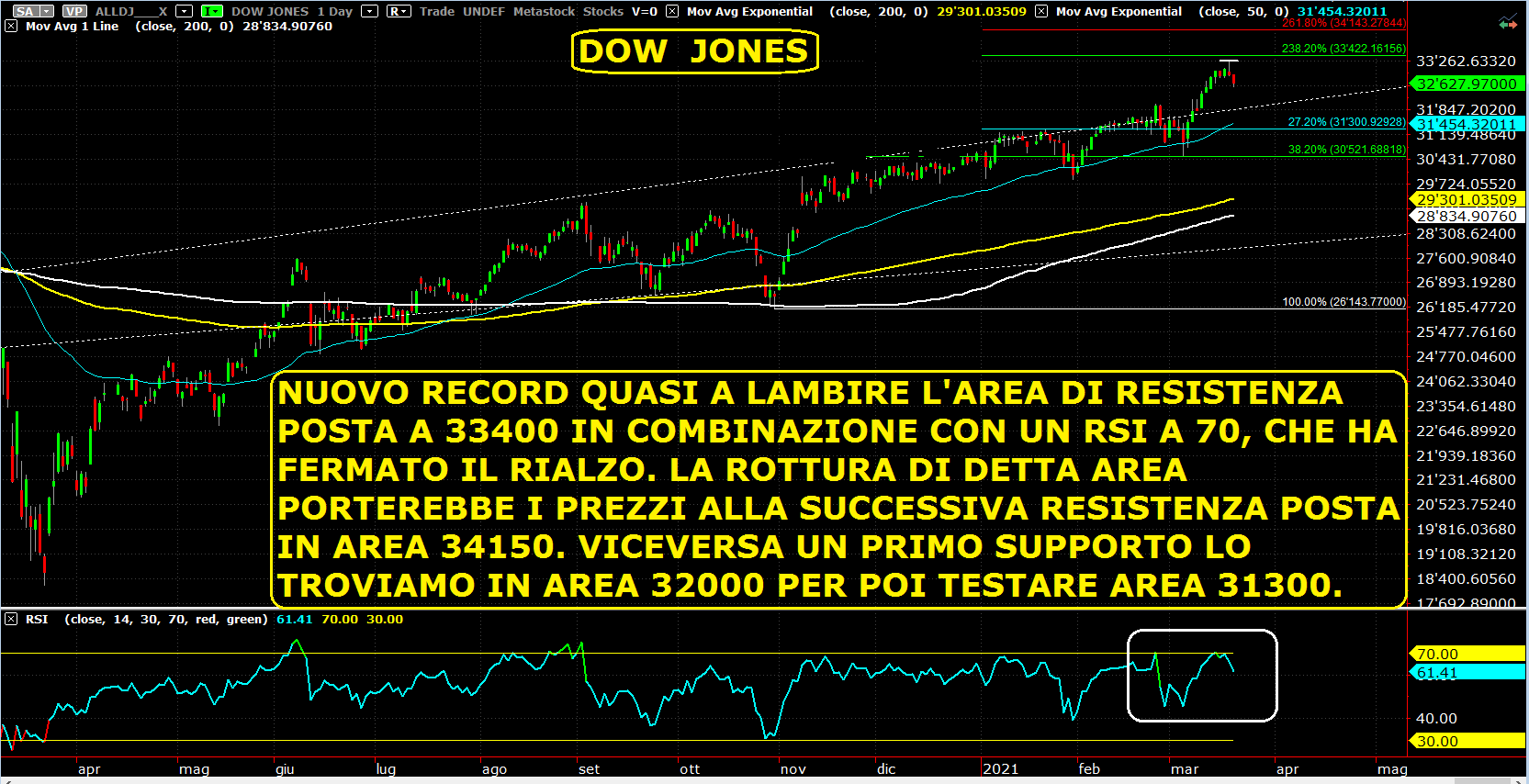 Prosegue il rialzo per l’indice DOW JONES che anche in questa settimana riesce a stabilire un nuovo record a 33227.78 ad un passo dalla resistenza posta in area 33400, rotta la quale la proiezione porterebbe i prezzi in area 34150. Rispetto all’S&P500 il livello di RSI è più alto ed appena ha sfiorato l’area di ipercomprato a 70 le vendite hanno colpito anche questo indice nel fine settimana. Vedremo nel corso delle prossime sedute se il rialzo proseguirà o una salutare correzione riporterà i prezzi a testare l’area dei 32000, oppure proseguirà la corsa verso il supporto in area 31300 (ritracciamento del 27,2%). Le contrattazioni della scorsa settimana si sono chiuse a 32627.97 il che porta ad una perdita del – 0,46% il che riporta ad una performance del + 6,60% da inizio anno 2021.
