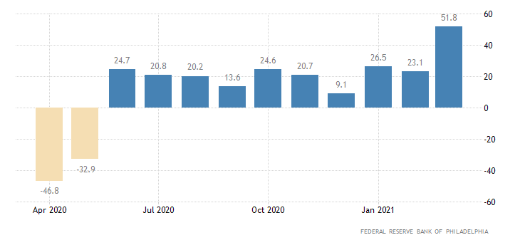 Sorpresa positiva da parte dell’indice sullo stato di salute del settore manifatturiero della regione di Filadelfia che registra un grosso incremento passando dai 23.1 punti di febbraio agli attuali 51.8 con stime per 23.3, marcando il massimo dal 1973. Il sottoindice dei nuovi ordini, passato da +27.5 a +50.9, ha fatto registrare il livello massimo da 50 anni, ed anche le spedizioni (da +8.7 a +30.2) e l’occupazione (da 4.8 a +30.1) hanno dato letture molto positive. Il dato è rilasciato dalla Federal Reserve di Filadelfia.