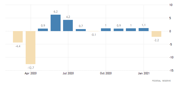 Dopo quattro mesi consecutivi con il segno ‘più’, a febbraio anche per la produzione industriale si torna a vedere il ‘meno’, con una contrazione del 2,2%. Il dato di gennaio è stato revisionato all’1,1% (da 0,9%) e per febbraio il consensus era stato fissato allo 0,3%. Il dato è rilasciato dalla Federal Reserve.