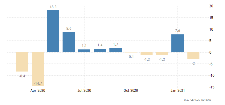 Mese di febbraio in negativo per le vendite al dettaglio, che calano al -3%. Per trovare un dato peggiore bisogna tornare ad aprile 2020 (in quel caso ci fu addirittura un -14,7%). Dopo il +7,6% di gennaio, il consensus era stato fissato al -0,5%. In contrazione anche il dato sulle vendite al dettaglio del Control Group con un -3,5% contro previsioni di un calo più contenuto, per la precisione dello 0,9%. Anche in questo caso si tratta del numero più negativo da aprile 2020 (in quel caso si registrò un -12,4%). Ma ci sono diverse attenuanti a cominciare dal fatto che a febbraio ci sono state le tempeste di neve, ed un pullback delle vendite era da attendersi, poi il dato di Gennaio è stato rivisto da +5.3% a +7.6%, un balzo enorme dovuto alla spesa degli assegni da 600 $ inviati a dicembre. Già da ora possiamo solo immaginare cosa succederà a marzo con gli assegni da 1.400 $. I due dati sono rilasciati dall’U.S. Census Bureau.