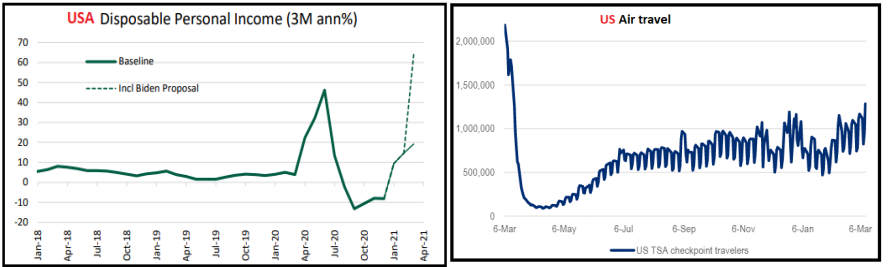 Gli indizi che l'azionario USA si sta assuefacendo a dei tassi leggermente più alti stanno aumentando di numero. Considerando che i rendimenti hanno superato i record precedenti portandosi sopra la soglia dell'1.7% con gli investitori che attribuiscono anche una probabilità non trascurabile al fatto che la FED sia costretta a muoversi prima del 2023, la reazione dell'azionario è stata abbastanza composta, solo gli indici del Nasdaq (100 e Composite) hanno accumulato un discreto passivo, poi rientrato, mentre gli indici S&P500 e DOW JONES hanno fatto registrare nuovi massimi storici rispettivamente a 3983.87 e 33227.78 con le banche in guadagno e il tech e i semiconduttori in calo, insieme all'energy, danneggiata da una correzione del petrolio, a conferma che è in atto un'accelerazione della crescita, specialmente in questo momento, legato alle riaperture e all'esplosione di stimolo fiscale che sta investendo l'economia USA (v. grafico con balzo del reddito disponibile e miglioramento del traffico aereo):