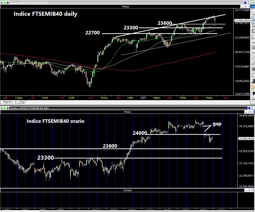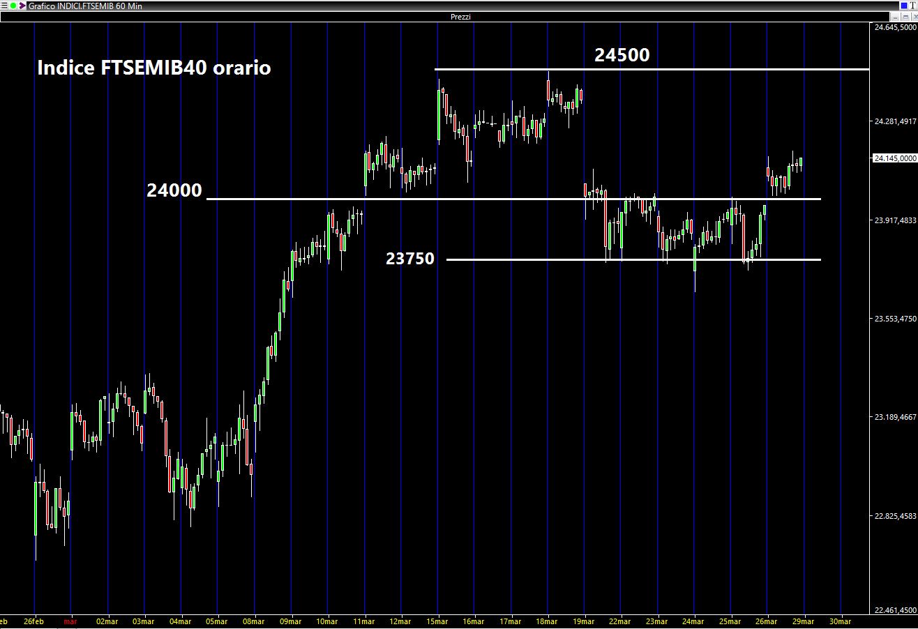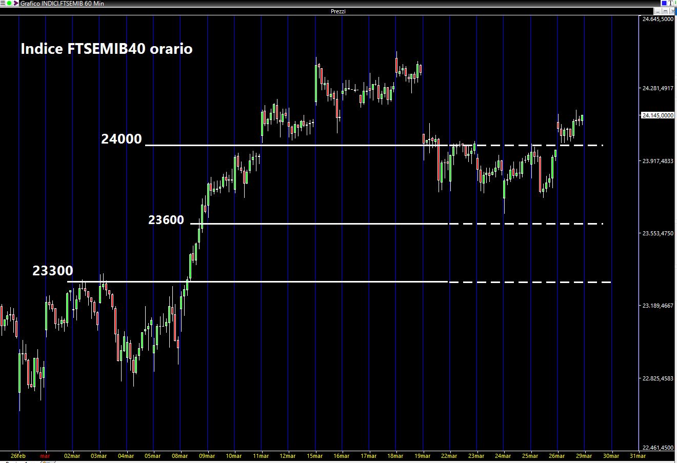 Siamo andati vicini ai 23600 (minimo 23650) come punto di massima estensione al ribasso, mentre i 24000 hanno sostanzialmente costituito una sorta di baluardo che è stato rotto parzialmente nel pomeriggio di venerdì (orario e seduta spesso poco affidabili). Volumi piatti sia sul mercato italiano che su quelli stranieri e questo implica il fatto che l'operatività sia ridotta al lumicino. Nonostante questo stiamo entrando nel mese di Aprile, statisticamente rialzista. Ricordo che Venerdì 2 Aprile Borsa Italiana sarà chiusa in occasione del Venerdì Santo.