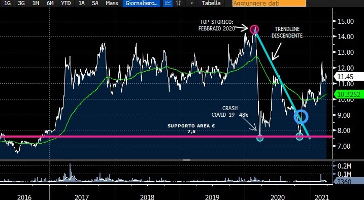 Il titolo, dopo la segnalazione, ha rotto al rialzo la trendline discendente azzurra ed ha proiettato le proprie quotazioni fino a raggiungere quota 12,5.