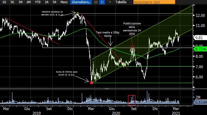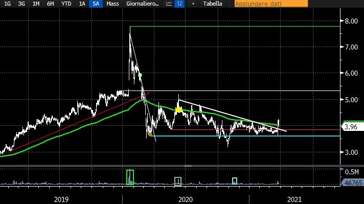 La pubblicazione dei risultati del 2020 ha rappresentato un interessante catalyst: il titolo è uscito da una lunga congestione provando a forzare a rialzo la media a 200 giorni.