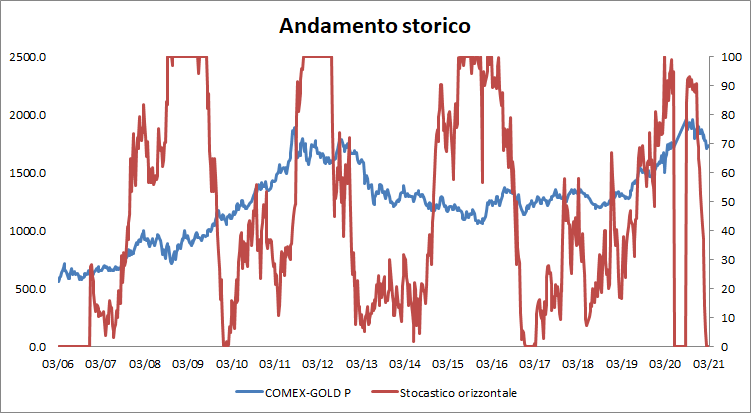 Lo Stocastico orizzontale del Comex Gold è decisamente interessante in quanto mostra dal 2006 un andamento sinusoidale, mentre si è mantenuto per il quasi un terzo del tempo al di sopra di 70; nonché il 14% del periodo sul massimo di 100. La permanenza al di sotto di 30 è simile e pari a 37% circa.