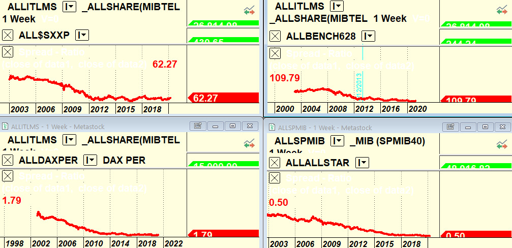 L’indice Ftse All Share rimane lesso rispetto agli altri indici internazionali (per il momento solo il Nasdaq vola in termini di forza relativa) e le curve di forza relativa sono piatte, segno che il nostro mercato si muove a traino degli altri.