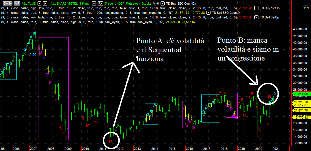 Tutti i nostri indicatori di sentiment sono piatti come il mare in un giorno di bonaccia (MC CLELLAN in testa a tutti) mentre gli indicatori ciclici come il Sequential non sono molto significativi perché in una situazione di prolungato movimento orizzontale su bare mensile e settimanale e quindi per avere un vero e proprio movimento di inversione ciclico abbiamo bisogno di volatilità (come ad esempio nell’ormai leggendario 13 di fine ribasso del 2011 punto A del grafico mensile).