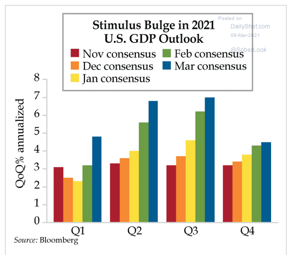 Quello che in questi giorni è cambiata è la prospettiva della crescita futura, che si annuncia tempestosa. Posto qui sotto un grafico che mostra a seconda del colore dell’istogramma come è cambiata la percezione / previsione della crescita trimestrale del pil USA nel corso degli ultimi 5 mesi: come vedete si tratta sempre e comunque di una crescita e l’istogramma blu del quarto trimestre 2021 è di proporzioni ciclopiche rispetto al primo trimestre 2021 di colore rosso mattone.