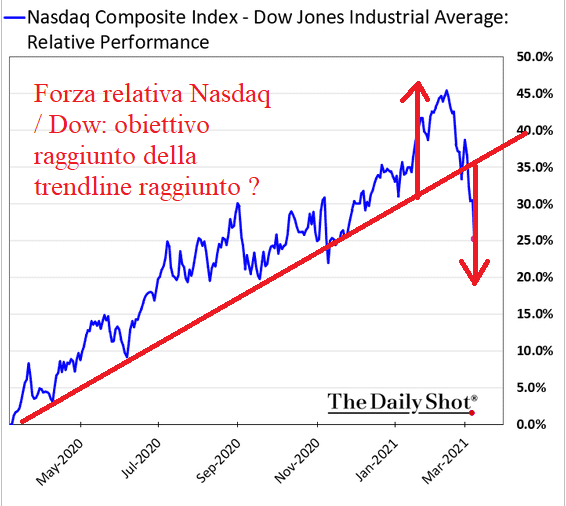 Il grafico che avevo mostrato la settimana scorsa con l’indicazione dei diversi supporti ha tenuto ma soprattutto c’è stata una violenta inversione di tendenza tra Nasdaq e azioni cicliche dell’economia. Il vecchio ha preso il sopravvento sul nuovo e il grafico che segue vi dà bene il polso di questa situazione: la forza relativa Nasdaq / Dow Jones ha rotto la trendline che la sosteneva ed è sprofondata raggiungendo l’obiettivo ribassista dato dalla massima distanza tra la trendline e il punto massimo superiore. Diciamo che ora la previsione è semplice: anche il Nasdaq dovrebbe smettere di subire rispetto al Dow Jones ed il rialzo di oggi lo testimonia.