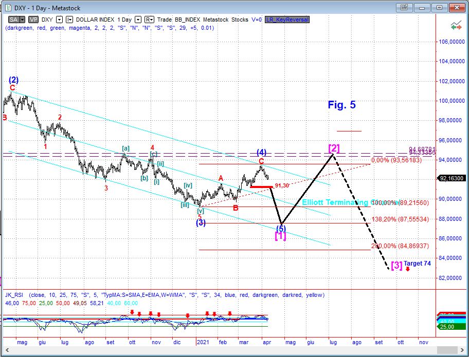 L’onda (5) è iniziata. SI potrebbe rientrare short sotto 91,30 con una buona leva perché non sarà un’onda lunghissima.