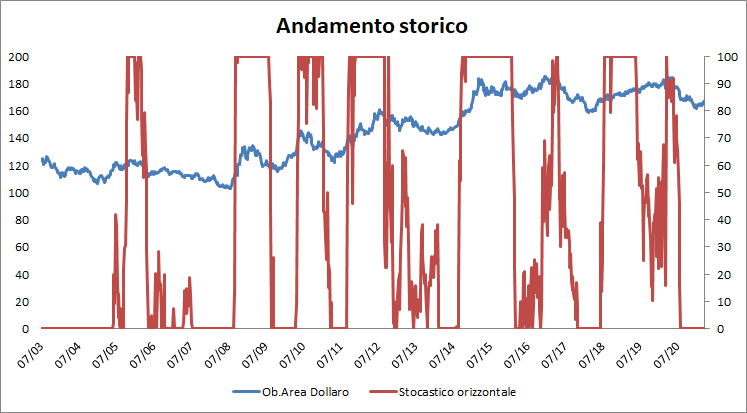Lo Stocastico orizzontale dell’indice Obbligazioni Area Dollaro appare immediatamente molto interessante per la ciclicità che evidenzia.