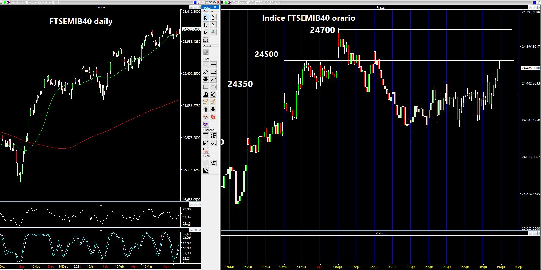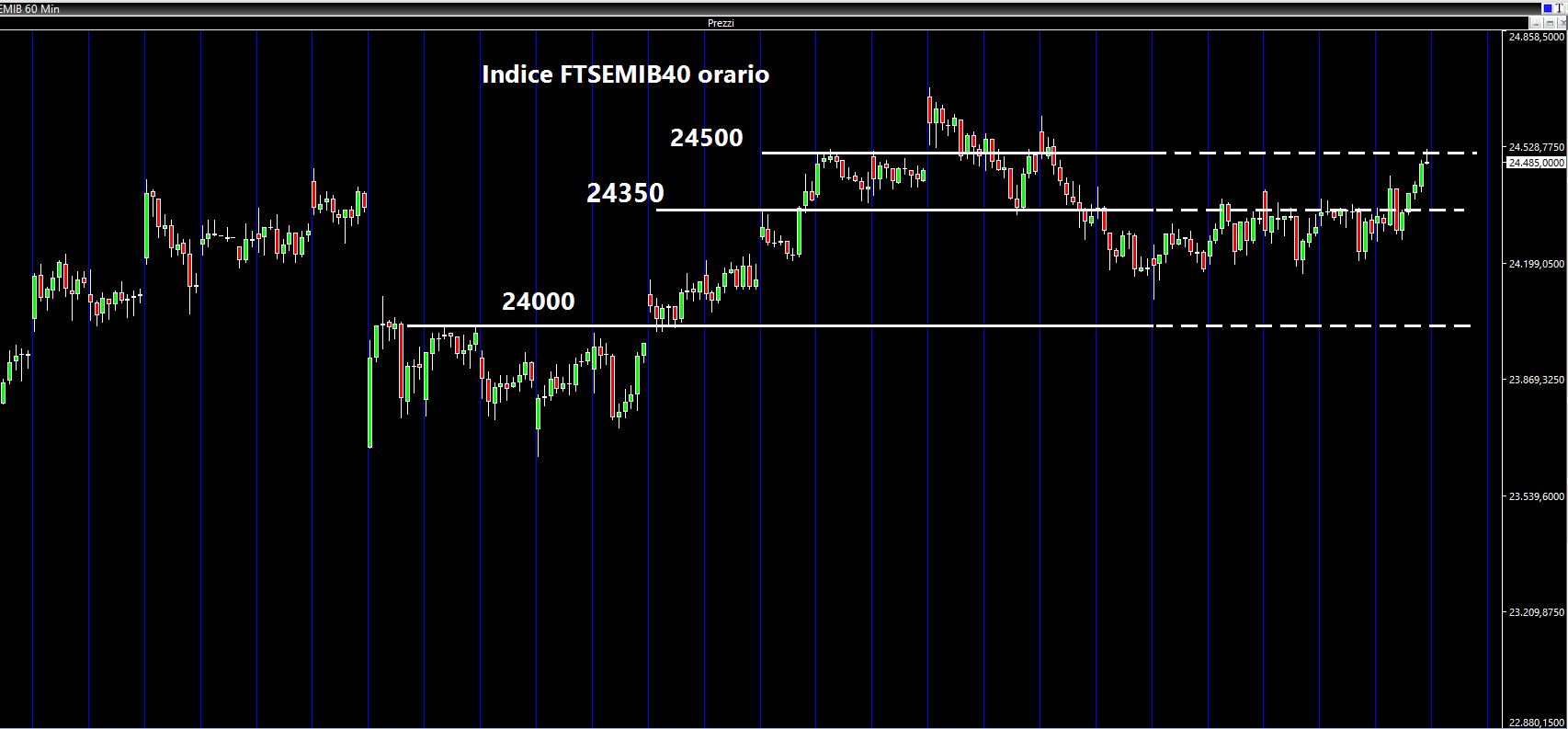 Per la prossima ottava continuerò a monitorare i 24350 come supporto. Al rialzo le resistenze sono poste a 24500 e a 24700.
