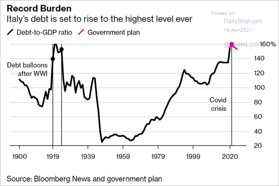 Per il nostro Paese i dolori verranno quando il boom sarà finito perché questa chart che segue e che è circolata insistentemente sui social questa settimana mostra come siamo proprio nello stesso punto in termini di debito / pil in cui eravamo dopo la prima guerra mondiale. E sappiamo che cosa è venuto dopo.
