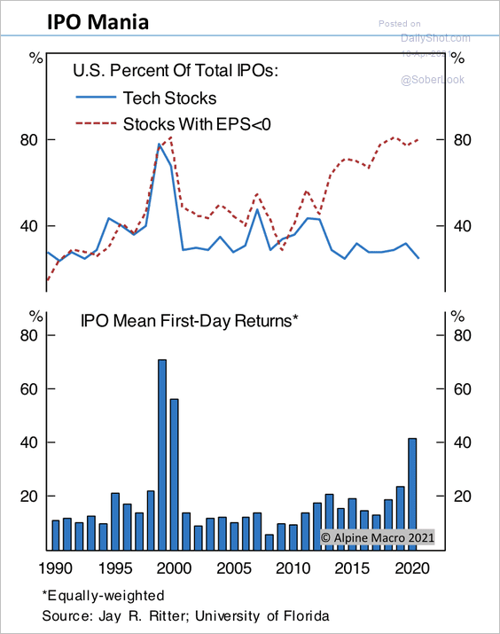 Un altro indicatore della bolla è la IPO mania e negli USA quotano di tutto, anche società che producono tostapane rotti, guardate un poco che siamo ai livelli del 2000:
