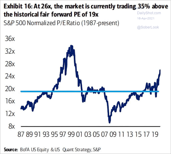 Non so se sia vero che l’economia sia una scienza triste: la scorsa settimana ci sono state notizie macro che facevano scappare da ridere tanto erano buone. Il Wall Street Journal ha titolato: “Negli USA non ci sono più case costruite da vendere, non ci sono più case in costruzione da vendere e purtroppo non ci sono nemmeno più nuovi costruttori”. Il mercato immobiliare negli USA sta semplicemente volando. Oppure sentite questa: il PIL cinese del primo trimestre è cresciuto del +18%. Ah sì ? Ma vi rendete conto che se debbo calcolare l’incremento annuo debbo fare 1.18 elevato alla quarta che fa il +93% della serie la Cina punta al raddoppio ? Vi informo che la Cina nel 2020 ha avuto un PIL che nonostante la pandemia è cresciuto del 2,3%. Pronto ? Che siamo in bolla lo sappiamo tutti, ma questa è la ciliegina della torta, a patto di non bruciarsi con la prossima discesa. Vi posto qui di seguito un grafico che è molto significativo ed è il ratio normalizzato del forward Price / earning dal 1987 ad oggi: potete notare come sia del 35% superiore alla media storica di 19 …