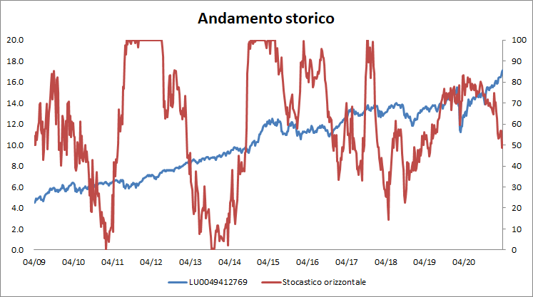 Il fondo è ottimo e lo Stocastico orizzontale lo premia dal 2014 in poi, mentre è sui massimi di sempre. Tuttavia, è salito del 60% negli ultimi 13 mesi, e non è poco…