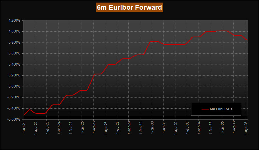 La nuova lettura della ZC-Yield Curve mostra ancora una sorta di stabilità dei rendimenti rispetto alla scorsa analisi, con solo qualche minimo aggiustamento su alcune scadenze, in particolare allargando un po’ su quelle lunghe. Il rendimento della scadenza a 10 anni sale leggermente portandosi allo 0,10% dal precedente 0,04% mentre la scadenza trentennale rimane ferma allo 0,50%. Non si modifica la forma della curva, ormai consolidata con la parte a breve e medio ben inclinata per poi ridurre l’inclinazione sul tratto a lunga e appiattirsi sulle scadenze dal 2045 in poi. La curva evidenzia sempre un massimo di rendimento sulle scadenze 2046-2048, ma ora sopra area 0,52% rispetto ad area 0,51% della scorsa analisi. Piccoli movimenti anche sui tassi forward su Euribor 6 mesi, con il tratto a medio che torna in area 0,80% di rendimento, mentre il tratto a lunga tende a salire si porta oltre area 1,00%. Il tratto a breve resta invece stabile, sempre inclinato positivamente e fermo intorno ad area -0,40%.